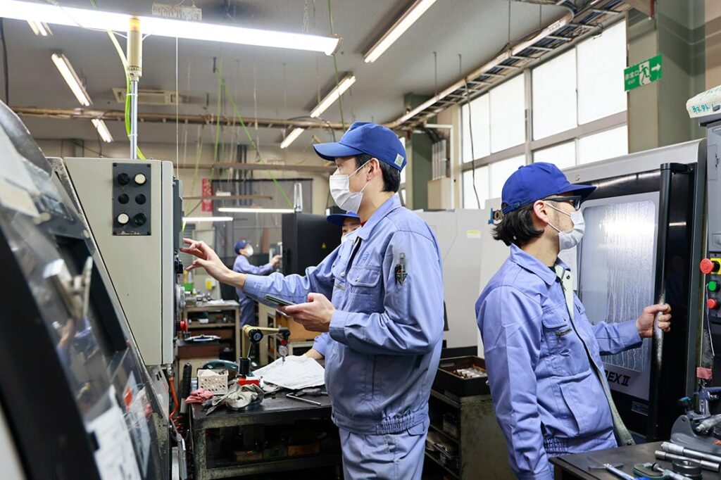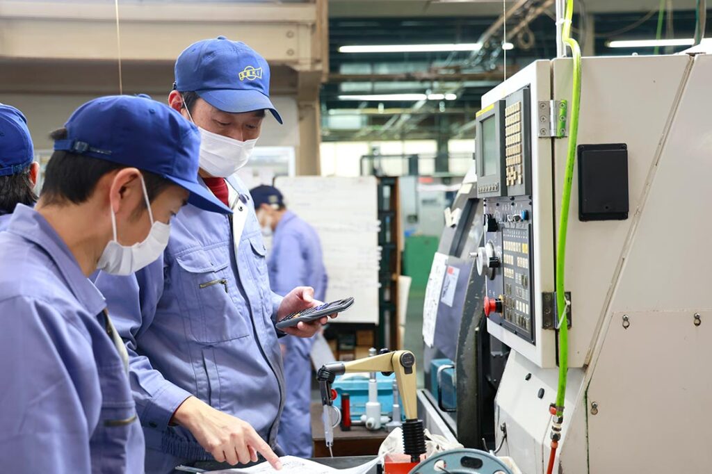 さまざまな種類の金属を加工し、工場設備やエンジンに使われる精密部品をつくっています。「NC旋盤」や「マシニングセンター」で金属をいろいろな形に削って部品を作り、最後に専用の機械で表面をなめらかに整えることで、図面に書かれた通りの正確な寸法に仕上げています。また、次の工程で作業する人がやりやすいように、部品の向きや仕上げ方にも気をつかい、チーム全体でよりよい製品づくりを行っています。